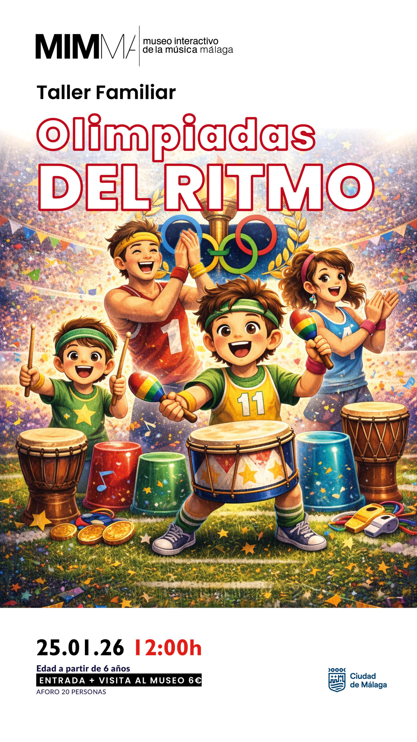 ¿Te imaginas unas olimpiadas donde el ritmo es el protagonista? En el MIMMA te invitamos a vivir nuestras “Olimpiadas del Ritmo”, una experiencia en la que música, movimiento y juego se combinan para que las familias descubran nuevas formas de expresarse juntas. A través de pruebas llenas de dinamismo —palmas, saltos, acentos y creaciones propias— niños y adultos pondrán a prueba su coordinación y su creatividad mientras disfrutan de un ambiente divertido y participativo. ¡Anímate a compartir esta aventura musical en familia y descubre cómo el ritmo puede convertirse en todo un desafío… y en una fiesta!